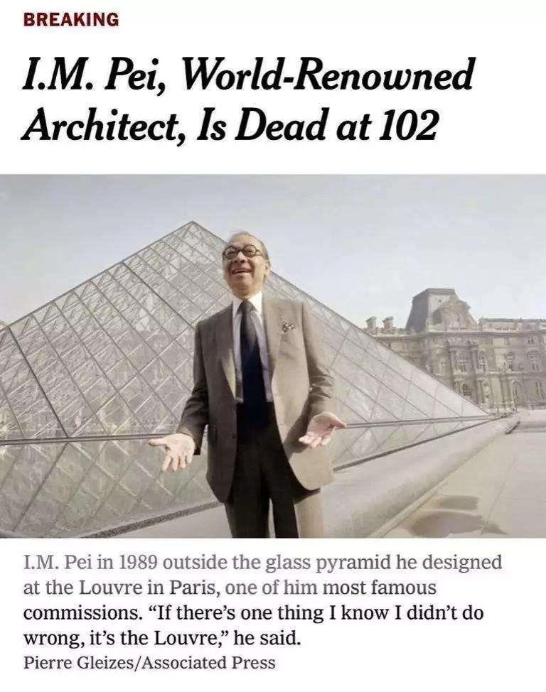早晨一醒来,手机通知栏即被一条来自大洋彼岸的新闻填满:享誉世界的美籍华裔建筑大师贝聿铭去世,享年102岁。这是一个简短的新闻,单套用一句时下流行语“新闻越短,事情越大”。