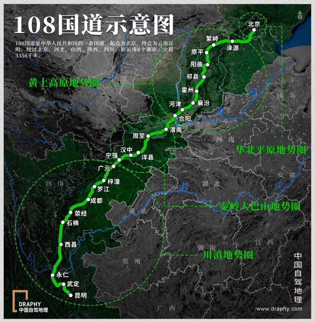 唯一穿过秦岭的1字头国道,起于北京,途经河北、山西、陕西、四川,终于云南昆明,全长3356公里。