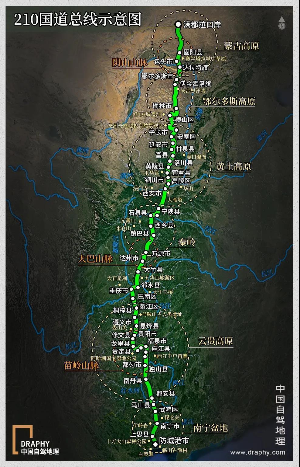 连通沙漠与海洋,曾经抗战时期重要的交通动脉,川黔公路渝黔段就在其中,起于满都拉口岸,途经陕西、四川、重庆、贵州,终于广西防城港,全长3097公里。