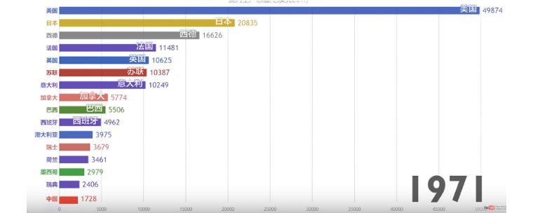 1971年,中国进入了前16名的行列(最下面红色为中国)