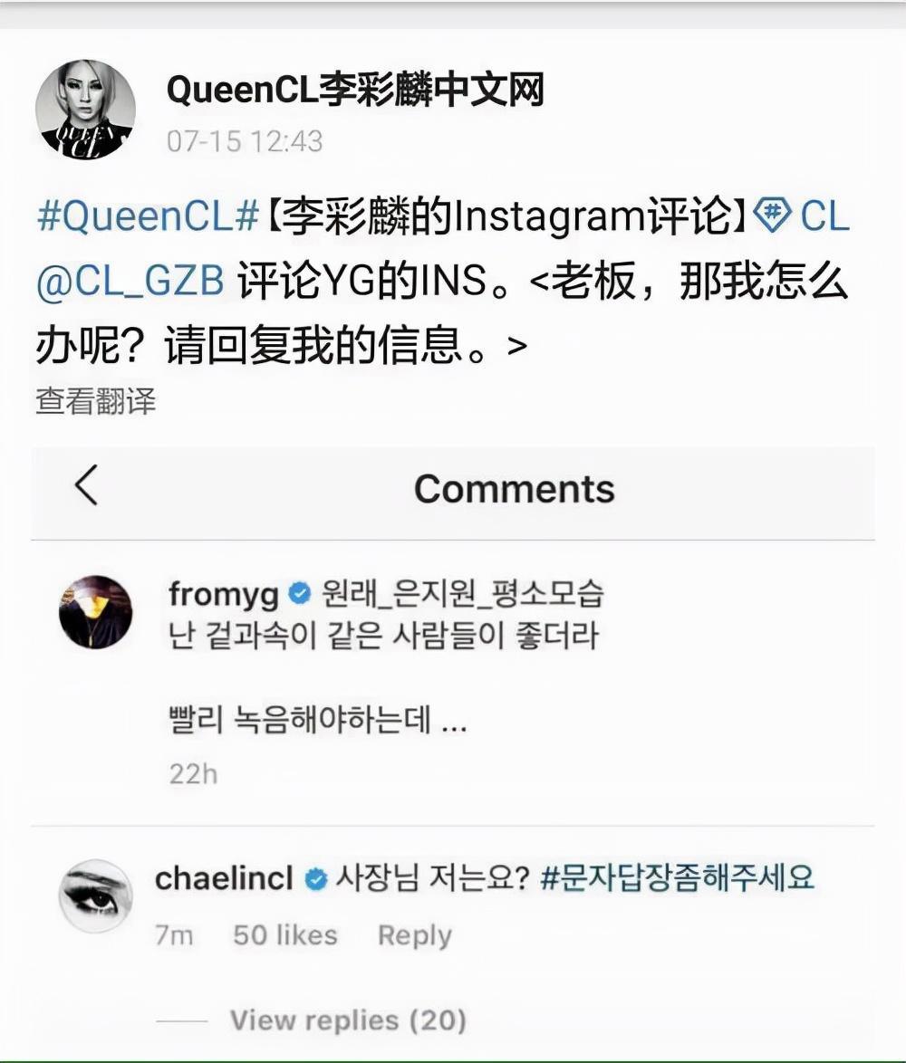 2NE1队长李彩琳,艺名CL,在YG当了多年练习生带领2NE1出道,虽然没有像少女时代那样登顶,却也中成为了韩娱的传奇女团,2NE1解散后CL留在了YG,没想到的是手握众多歌曲却得不到发行,甚至得不到资源,无奈公开怒怼杨社长(2018年7月15日),获得无数网友的力挺!