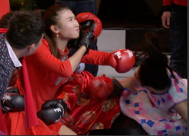 第一轮的喜从天降游戏,游戏规则为争夺从天而降的糖果枕头,抢到数量多的队为胜。姐妹连派出的是王媛媛和姚蓉蓉这两位女汉子,而兄弟盟派出的是张志波和王永贵老师。点点不禁替兄弟盟的两位捏了一把汗,你说一个是号称“逢波必败”的张志波,一个是穿着西装向最有绅士风度的王老师,他们能赢得闹腾腾的游戏吗?结果却让人大跌眼镜,王老师玩起游戏来丝毫也不“温文尔雅”。虽然张志波基本全程都在地上起不来,不能给王老师后援,但是媛媛和蓉蓉两位女汉子根本近不了王老师的身,女汉子的洪荒之力没有丁点发挥的机会。游戏结束,王老师一人就抢到了5个糖果枕头,敏健忍不住打趣道:王老师就是穿着西装的大灰狼啊!这样的王老师,想必也会让观众朋友们喜出望外!王大厨究竟使了什么绝招让两位女汉子望而却步?