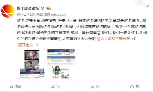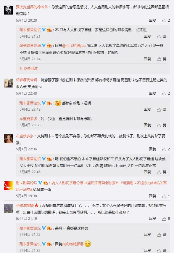 而耐卡也在微博上回应人人影视:以前没有,现在也没有,以后更不会。并且反骂人人影视才是真正的盗用者,并且附上两张证据图。