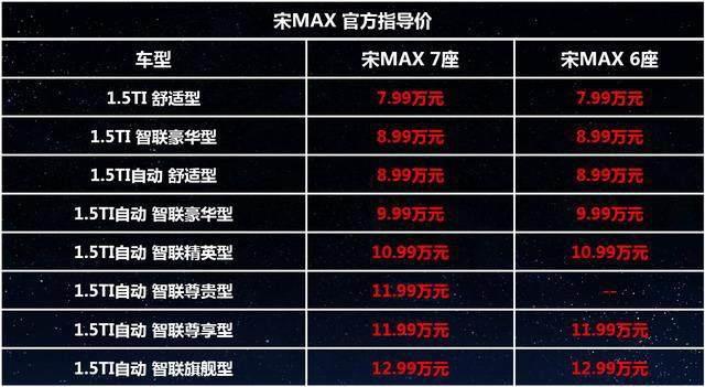 比亚迪宋MAX六座版于4月17日上市,车内座椅2+2+2的六座布局,新车共推出7款车型,其指导价区间为7.99-12.99万元。新车与同配置7座车型价格并无差别。同时7座版车型也在车型和配置上作出调整,详情见下表。自从国内二胎政策开放以来,普通的五座车型已经很难满足日常的家用,而且商务用车越来越偏向于商务车,如此一来各大车厂纷纷抓住机会,将目光锁定6/7座车型市场,我认为这款车在市场上会有不错的成绩,拭目以待。