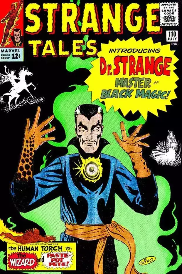 奇异博士1963年首登场于漫威《奇异故事》110期,起初叫奇异先生,全名史蒂夫·文森特·斯特兰奇,原型来自美国30年代电影《魔法师禅杜》——影片讲述了一位能够星际旅行、制造幻象的魔法师的神奇故事。