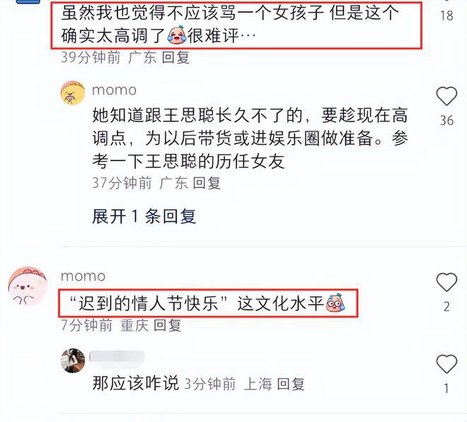 有网友表示小羽实在太高调了,一尝到点甜头就大肆秀恩爱,很难评。还有人觉得她长相普通、文化水平低下,方方面面都和王思聪的前任们没法比。
