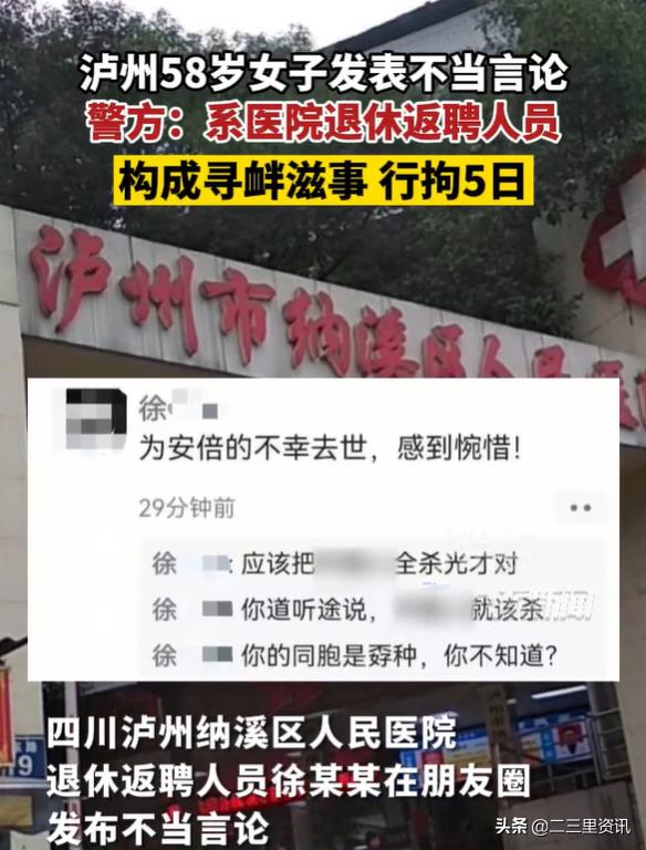 四川泸州一女子在朋友圈发表不当言论被拘留5日,系医院退休返聘人员