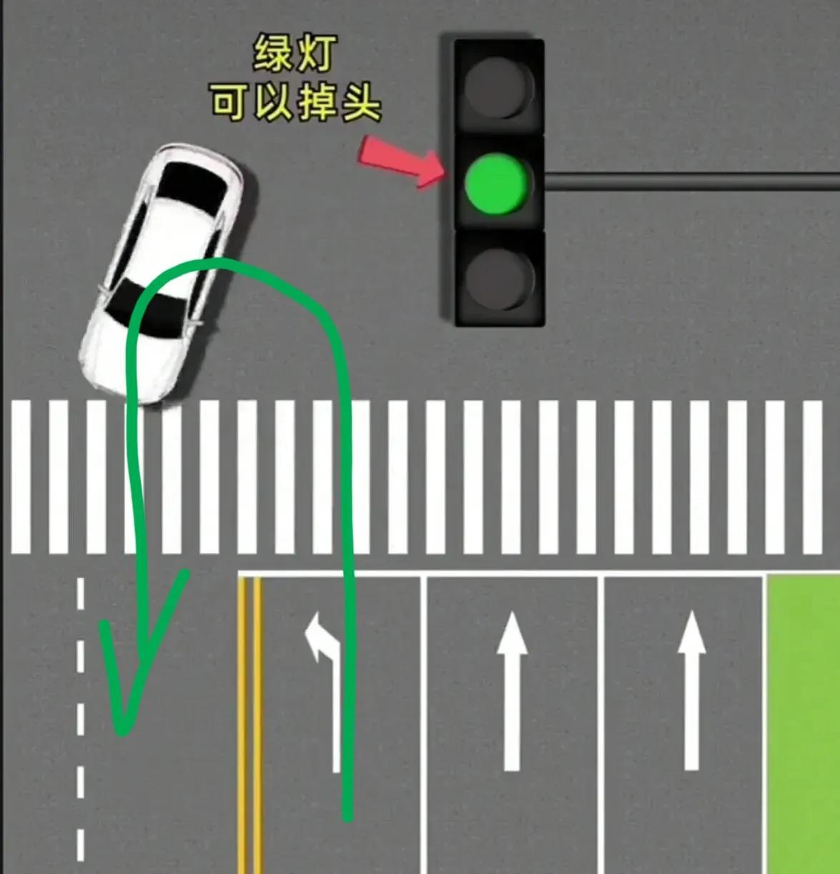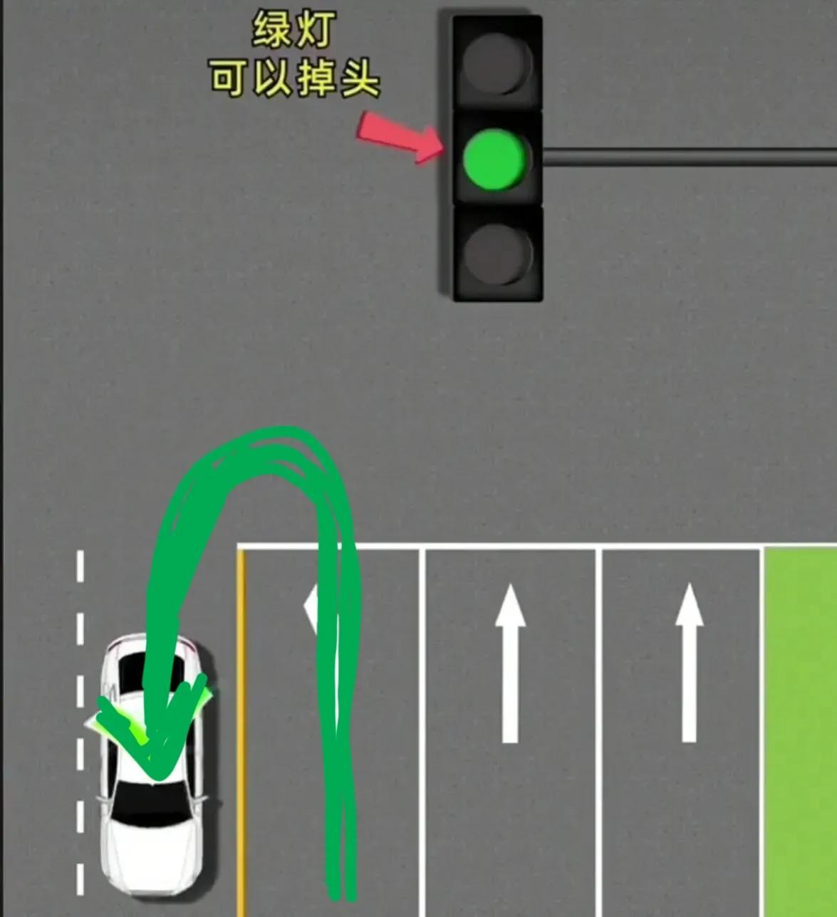 这种情况下,绿灯时都可以直接掉头。无掉头标志的路口,注意不要压黄实线就可以掉头。