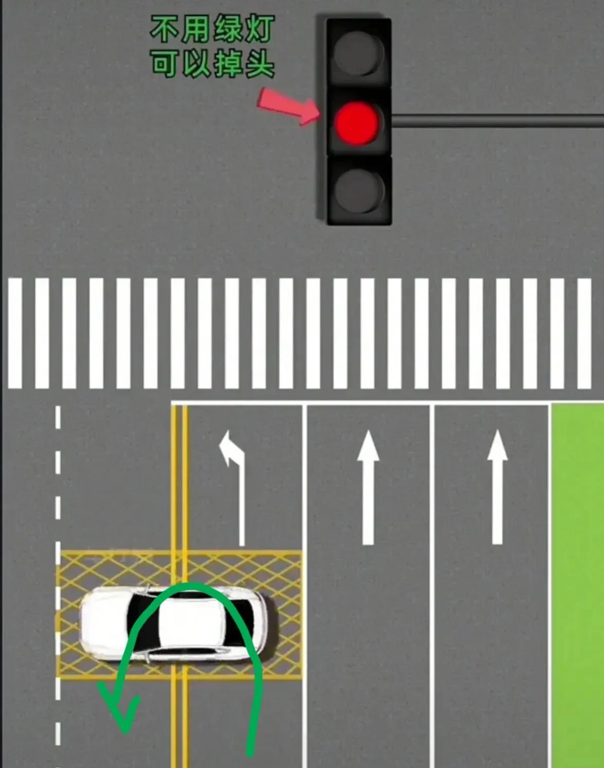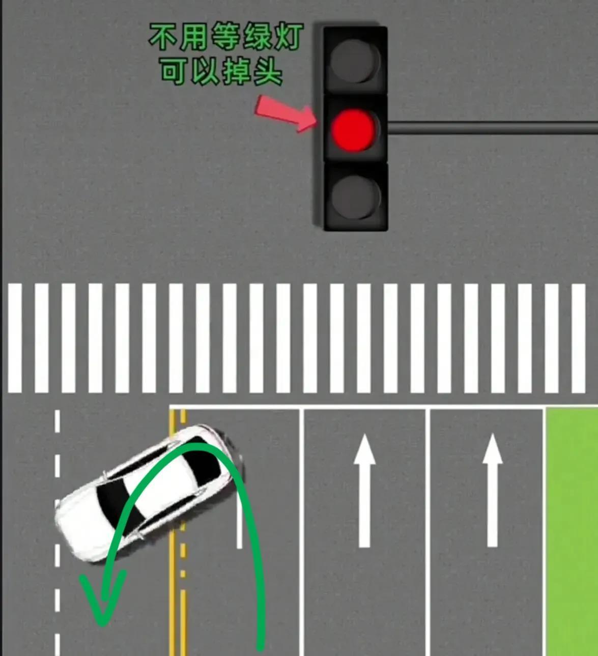这种情况下,绿灯时也都可以直接掉头。有待转区的路口,注意,这个要过斑马线礼让行人掉头。