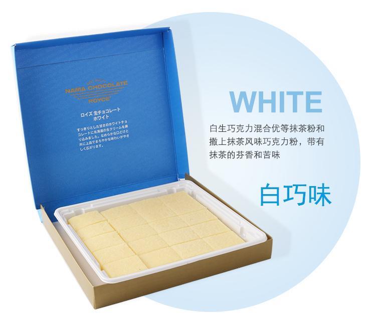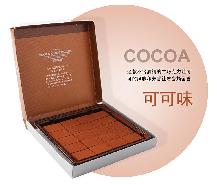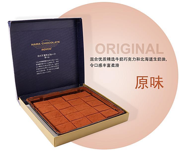 推荐理由:打开礼品纸的包装,有一个精致的纸盒,打开以后又一次惊呆了,还有一个密封的袋子,小日本对产品的极致精神也是醉了。切成小块的巧克力,裹在质地绒密细腻的可可粉里,品尝Royce'巧克力时,入口即化的绝妙口感,新鲜牛乳和可可豆的美妙滋味完美融合,使人自然联想起北海道的阳光和辽阔草原!这款是我最喜欢的!绝对颠覆你对巧克力的认识!原来巧克力也可以这么柔滑、入口即化!以水分14%以上,鲜奶油24%的生巧克力,再加上入口即化的绝妙口感,是生巧克力人气鼎盛不衰的主要原因原味这款必须尝试!