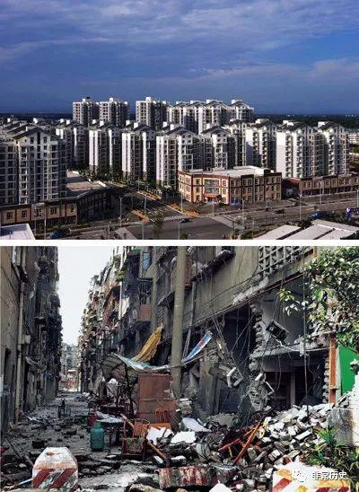 上图:异地重建的北川新县城,下图:被震毁的的北川县城