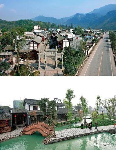 上图:恢复重建的绵竹市年画村,下图:被震毁的绵竹市年画村