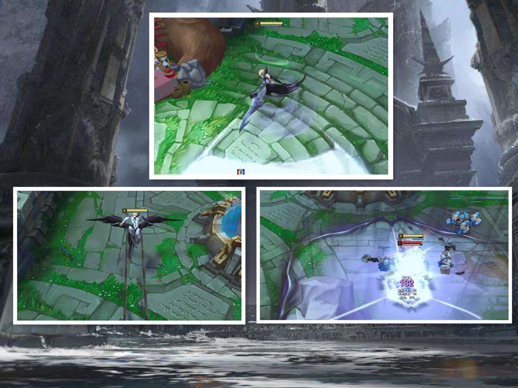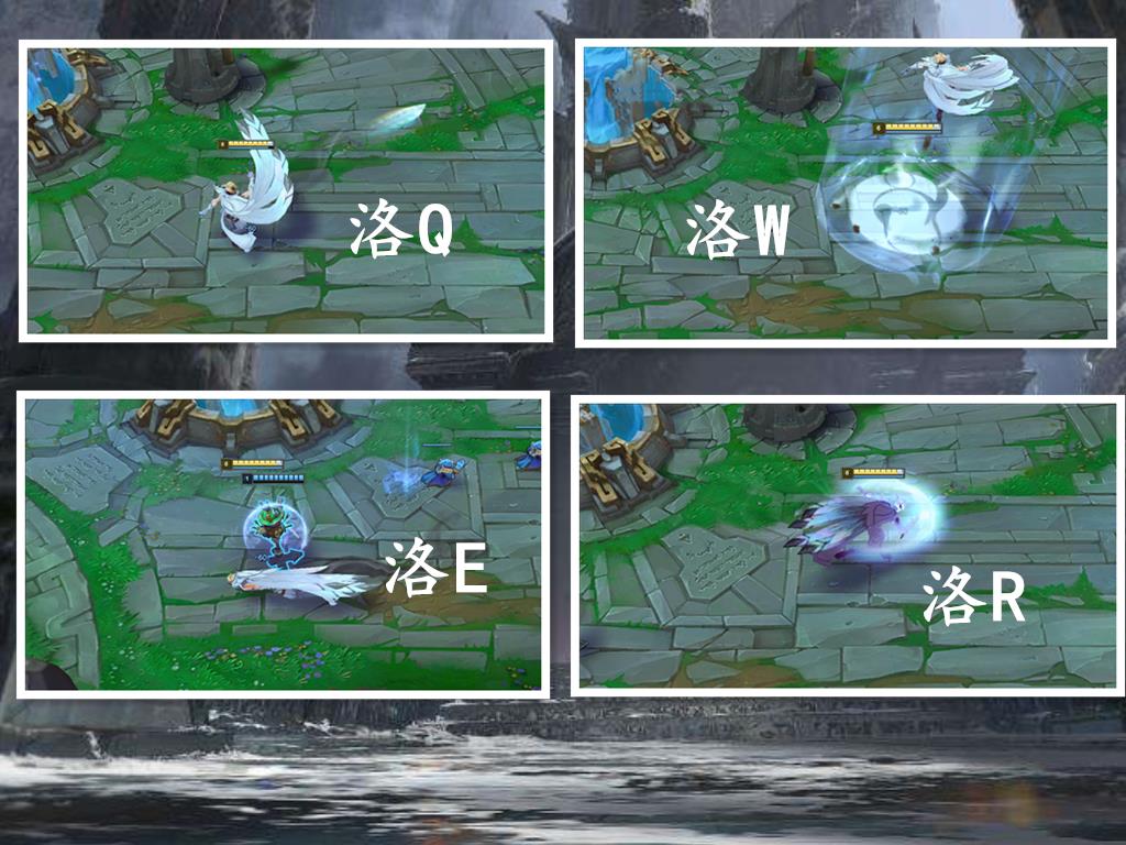 洛几乎就是一身白色了,Q技能丢出白色羽毛,W抬起对方时,脚下是有IG图标的光圈。E没什么好说的,直接位移到队友身上,洛简直像趴在地上一样,像个白色的大蝌蚪。R技能倒是比较好看,让洛黑化了一样,挥着黑色的羽翼,像找人复仇一样,义无反顾的冲上前去。
