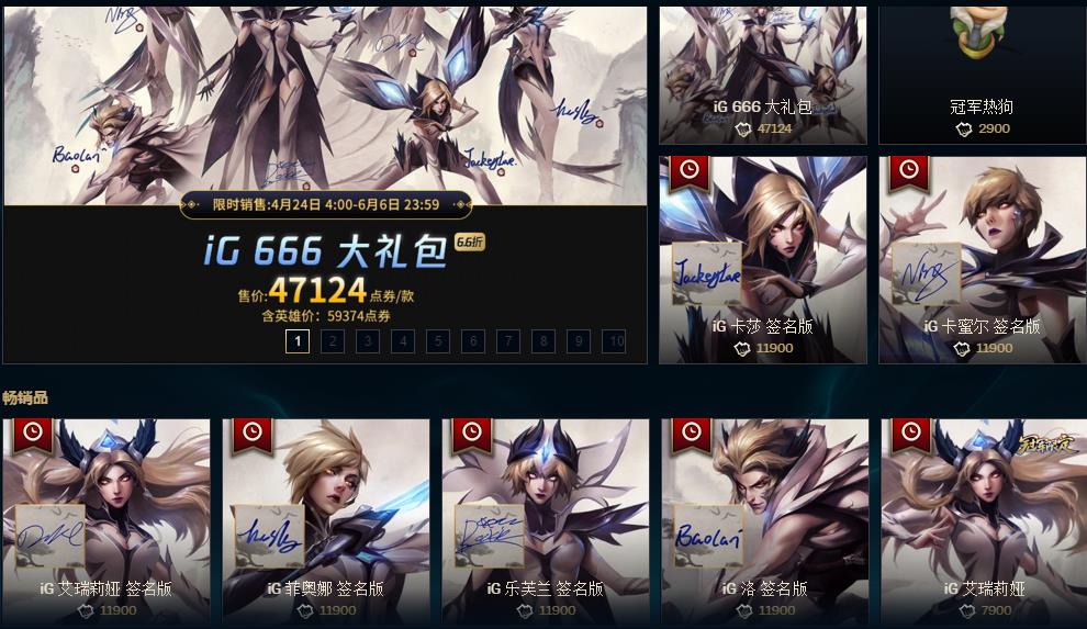 LOL商城中目前已经有了IG冠军皮肤,有两种购买的方式,一种是买大礼包,另外就是单个买,时间是4月24日到6月6日,长达两个多月。而选手签名版的皮肤,又要比冠军皮肤略贵,冠军热狗卖29元,具体可参照上图。话不多说,我们来看看这6款皮肤,到底哪一款值得购买呢?