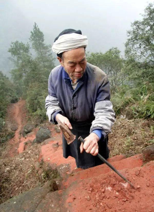 原来,为了躲避世俗的流言蜚语,他们跑到了大约海拔1500米渺无人烟的深山中隐居了。刘国江砍柴时知道深山里有2间废弃的茅草屋。从此,他们在此定居,从那时起,刘国江为了徐朝清能够安全、方便的下山,与外界联系,开始在悬崖峭壁上开凿石阶,几十年从未间断,最终共开凿6208步,是为爱情天梯。