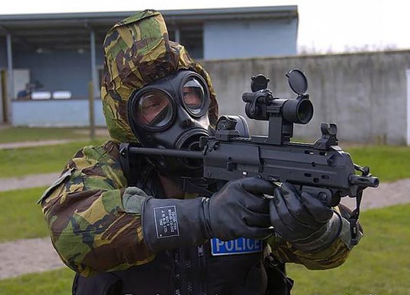 手持MP7-SF并身穿防化衣的英国国防部警察警员