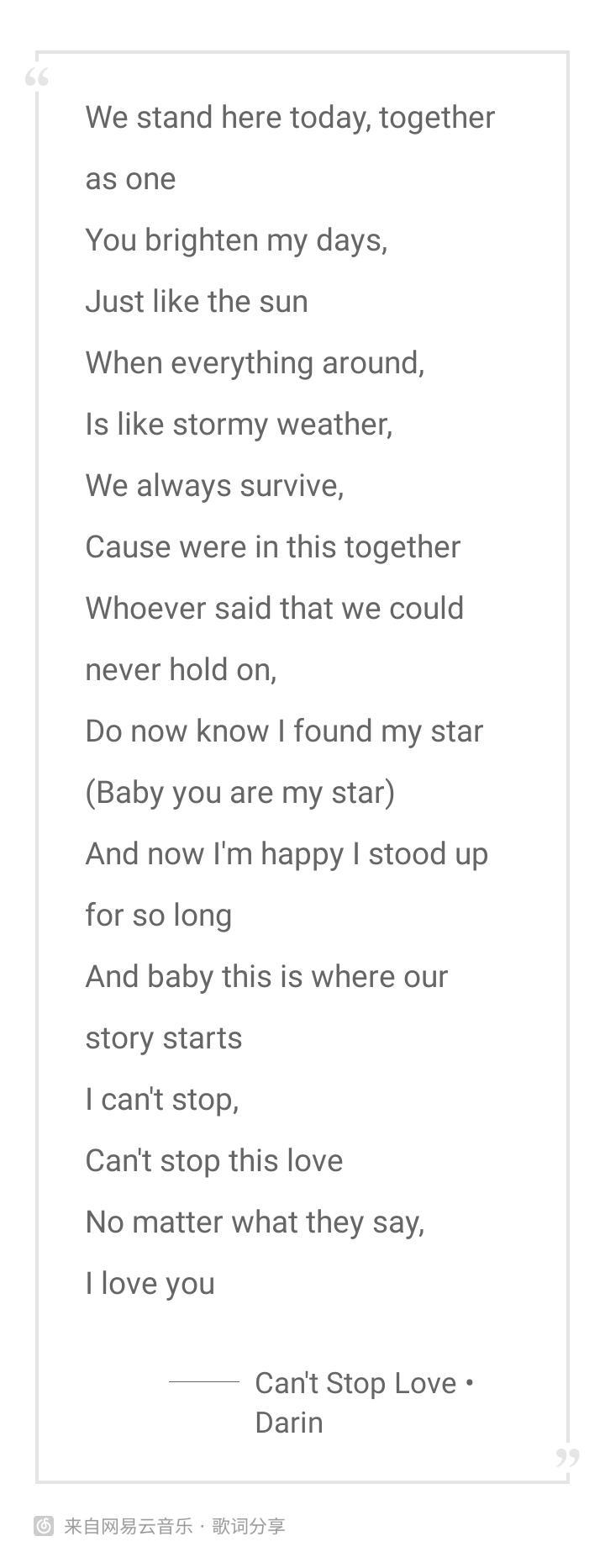 歌词大意:今日,我们一同站在这里,你仿佛太阳般,照耀了我的生活,当周遭的一切,如同暴风骤雨时,我们总是能幸存于此,因为我们在一起,谁曾说过我们不能长久,他是不知道我找到了我的那颗星,(宝贝,你就是那颗耀眼的明星),此时,我高兴地久久站立,宝贝,我们的故事由此开始,我无法停下,我无法停下对你的这份爱,无论旁人如何闲言碎语,我爱你,我停不下来,停不下来,我爱你,无论他们说些什么,我都爱你。