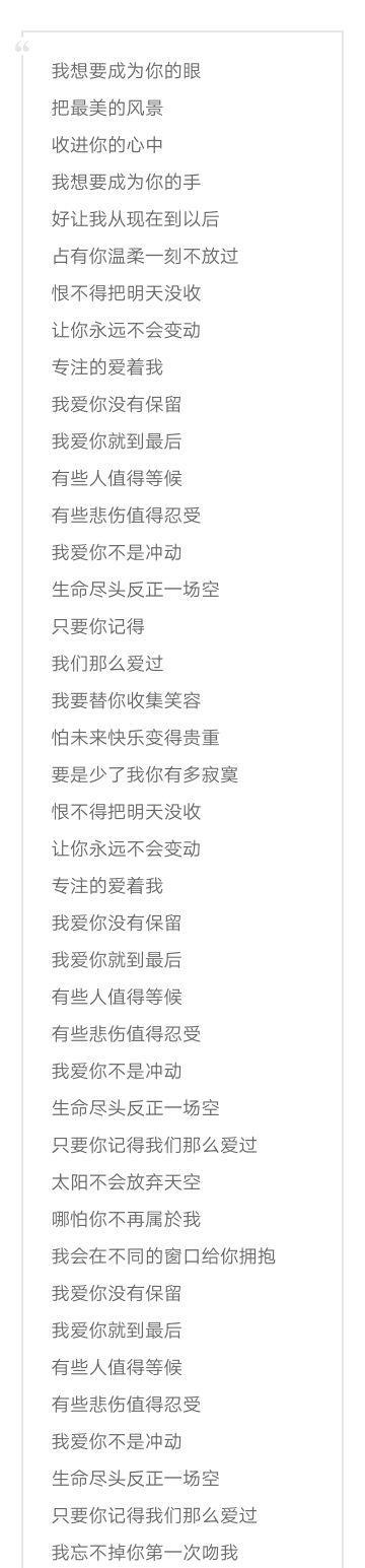 歌词大意:不确定你是否清楚,当我第一次见到你,我紧张到话都说不清楚,在那一刻,我找到了我的唯一,终于填补了我生命中的缺失,所以我会永远爱你,会一直拥抱守护你,穿着白色婚纱的你如此美丽动人,直到我生命结束,我都会铭记这一天,今晚白色婚纱的你是如此美丽动人,我们拥有的是天长地久,我对你的爱是无穷无尽,我要把这个梦想告诉全世界,你是我全部的动力,你是我全部的信仰,每个字都由心而发,所以我会永远爱你,会一直拥抱守护你。
