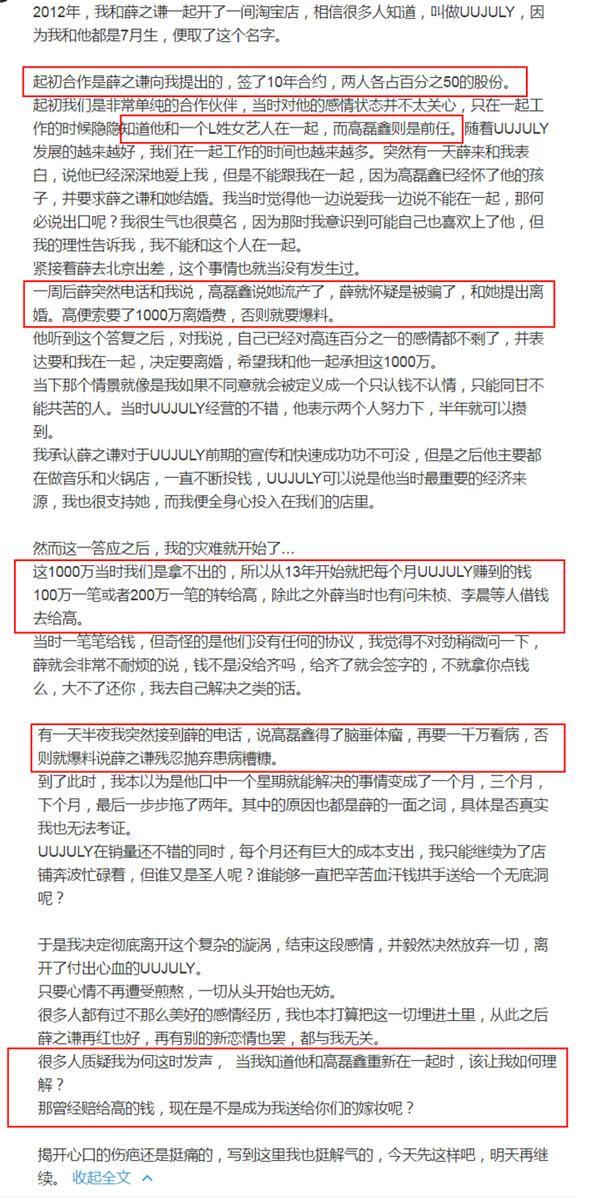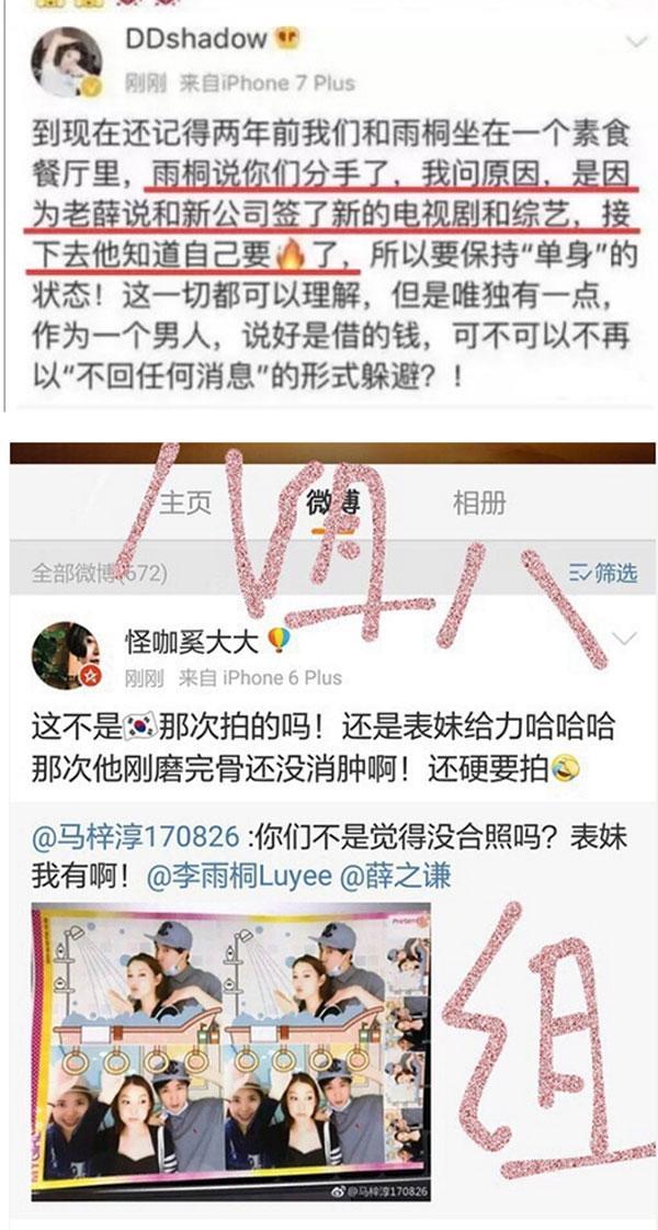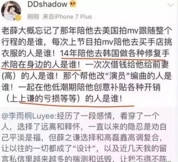 最大的新闻莫过于,前合作人李雨桐在自己微博上发文爆,薛之谦在未红之前,曾经跟她交往过一段时间。而跟她交往的时候,薛之谦多次向她要钱支付给高磊鑫,直到最后她不堪其扰,选择离开了薛之谦以及他们一手创立的服装公司,李雨桐在文中,还不小心爆出薛之谦曾和一个姓L的小姐在一起,而这个姓L的小姐,也被网友扒出就是女演员娄艺潇。李雨桐说,选择这个时间点爆出来,是因为薛之谦跟高磊鑫的高调复合让她不适,深深感觉到了背叛。