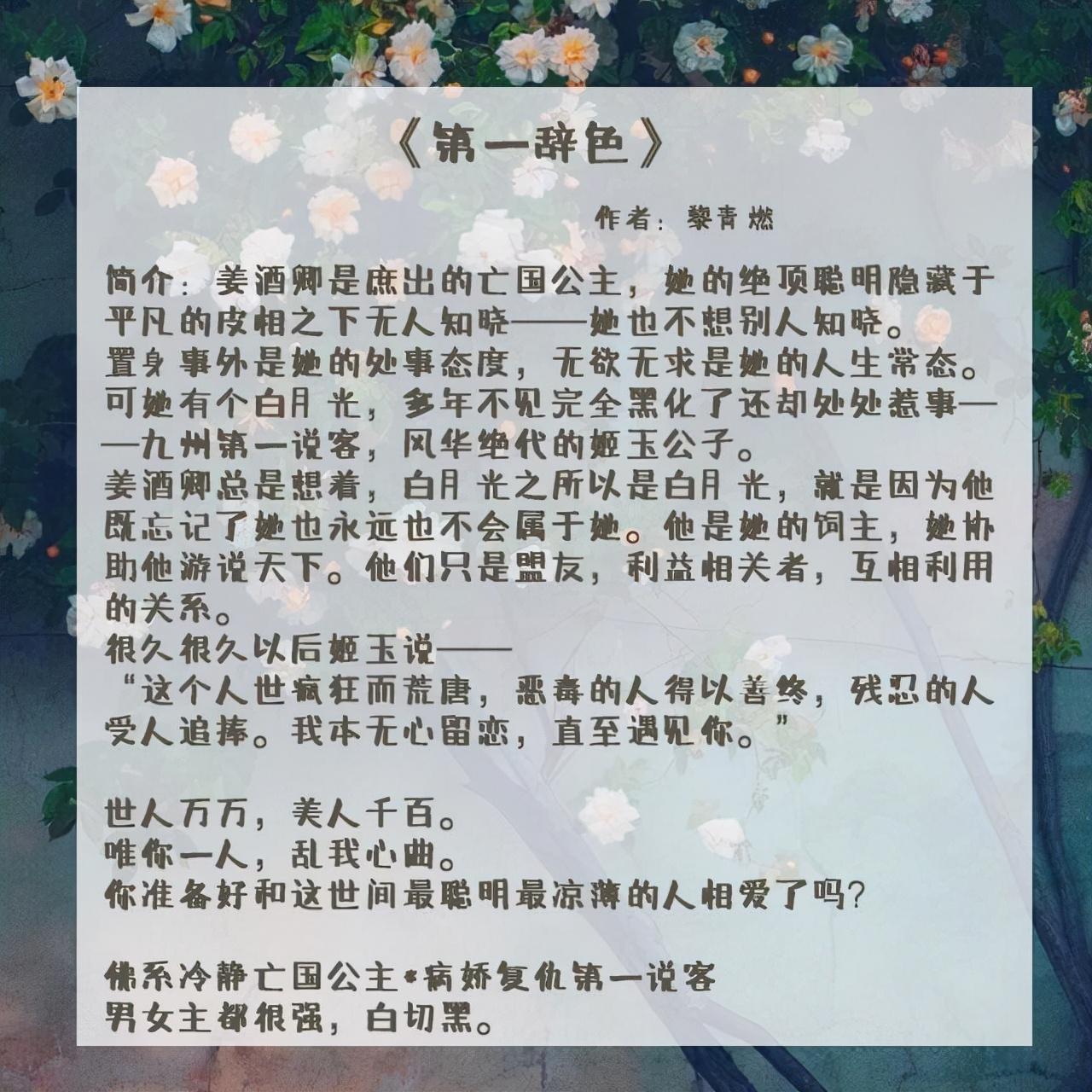短书评:女主是庶出的亡国公主,绝顶聪明却很低调,得到过的东西太少也就对事物没什么太大的执着了。男主一开始对女主只是利用,后面渐渐产生兴趣。女主小时候遇见的白月光后面发现其实是男主。但是她一直欺骗自己喜欢的只是阿夭,因为女主有点自卑,她害怕满腔深情被人当作利刃。还好男主不是直男式恋爱,会反思,会为女主放下仇恨,最主要的是会撒娇啊。这篇是第一人称的文哦,文字很简约,但是读者很容易带入女主,有一种忍不住伤心的冲动。男女主都是世间难得的超级聪明的人,势均力敌的爱情的火花四溅又互相救赎。