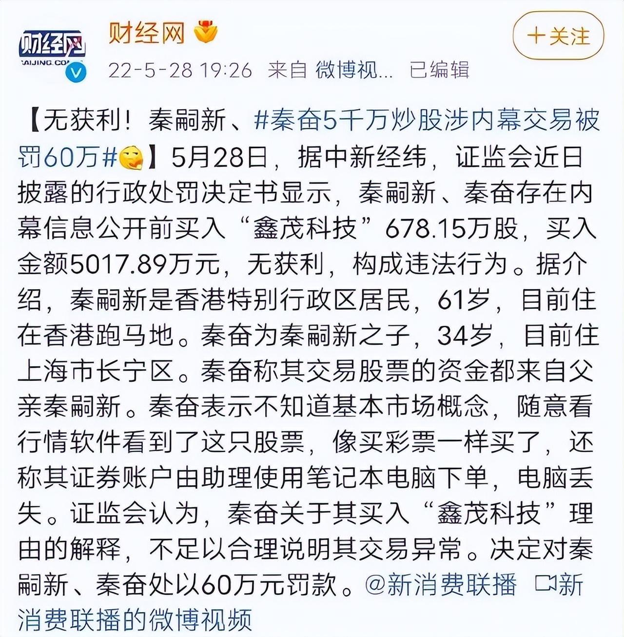 根据众多媒体爆料,秦奋与自己的父亲秦嗣新两人因为内幕消息在某股公开前就买入,因为涉及到内幕交易,所以构成了违法行为,因此两人被罚款60万。而在这次消息披露当中,还曝光了秦奋的父亲秦嗣新是香港居民这件事。
