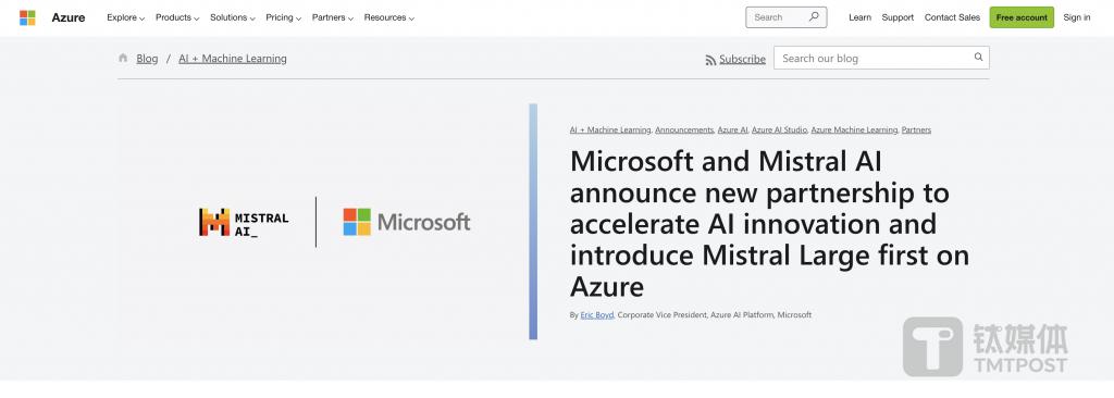 针对与微软的合作,Mistral CEO Arthur Mensch 表示:" 我们很高兴与微软建立这种合作伙伴关系。借助 Azure 尖端 AI 基础设施,我们在扩张中达到了一个新的里程碑,推动我们的创新研究和实际应用程序向世界各地的新客户发展。我们共同致力于推动 AI 行业取得重要进步,并为全球客户和合作伙伴提供无与伦比的价值。"