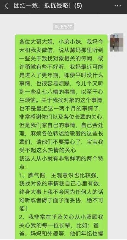 近日,一个叫小肚子吃不饱的杭州网友对各大亲戚的催婚表示无比头疼,忍不了无需再忍,姑娘霸气的在群里表示,别惹我,不然我不客气了!