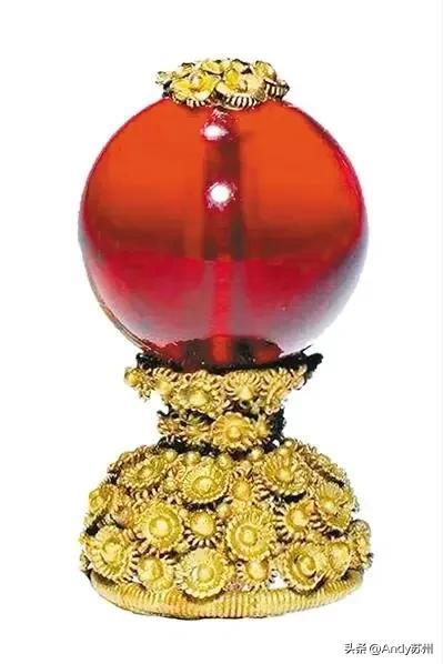 三品官顶戴上饰小红宝石,上衔蓝宝石。