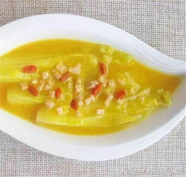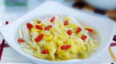 原料:白菜500 g、枸杞50粒、高汤适量、虾皮适量、胡椒粉2 g、盐3 g、冰糖3 g