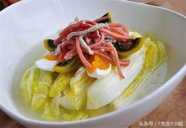 2.把皮蛋切好。白菜焯后马上过冷水,切好。