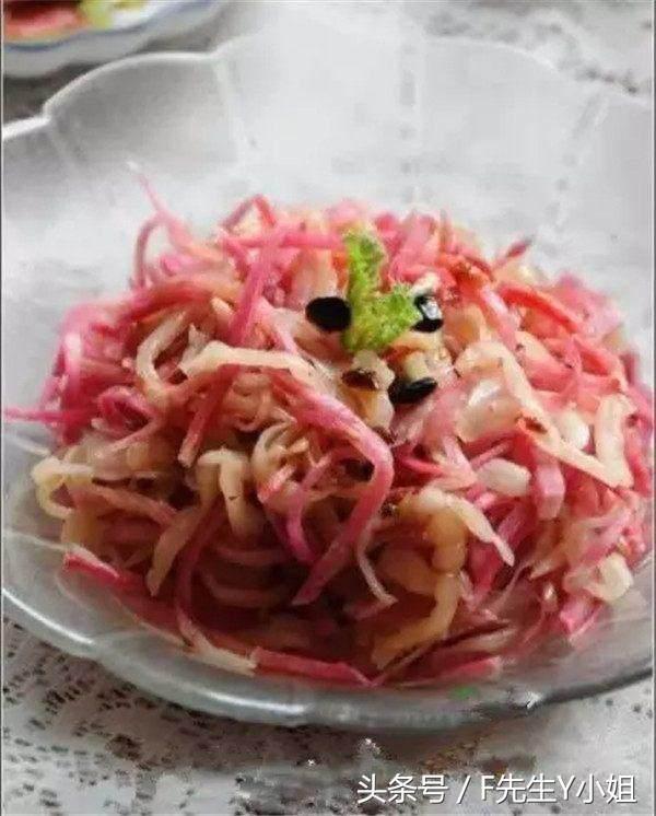原料:白菜心,心里美萝卜,糖,醋,白芝麻。