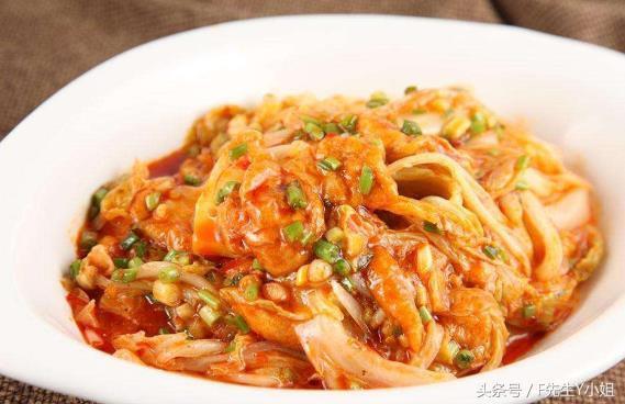 原料:净白菜300克,植物油30克,香油7.5克,花椒15粒,精盐4克,酱油15克,米醋15克,白糖22克,水淀粉20克。