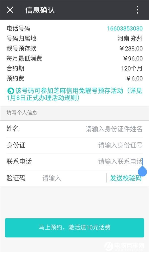 以笔者测试所选的归属地河南郑州尾号3030的所谓靓号为例,需要预存288元,每月承诺最低消费96元,合约期120个月(10年),另外还有6元的预约费。