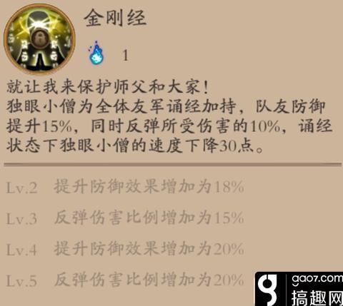 提升全体友军15%的防御,同时反弹所受伤害的10%,此时独眼小僧的速度下降30点。一个不错的团队增益,最主要的是只消耗1火!