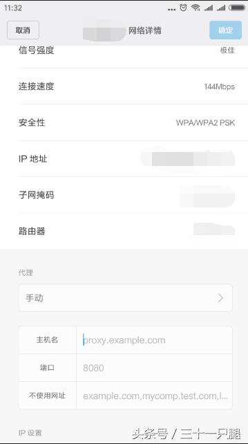 再进入你连接上的WIFI的网络详情,在下面代理处选择手动!输入:主机名处填ip地址,端口,其他不管,记得保存!