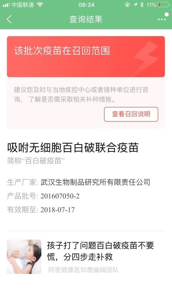 如查询结果页面上显示“该批次疫苗在召回范围”的警示信息,则建议消费者及时与当地疾控中心或者接种单位咨询,了解是否需要采取相关补种措施。