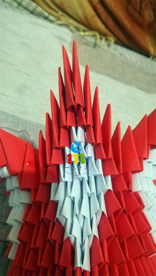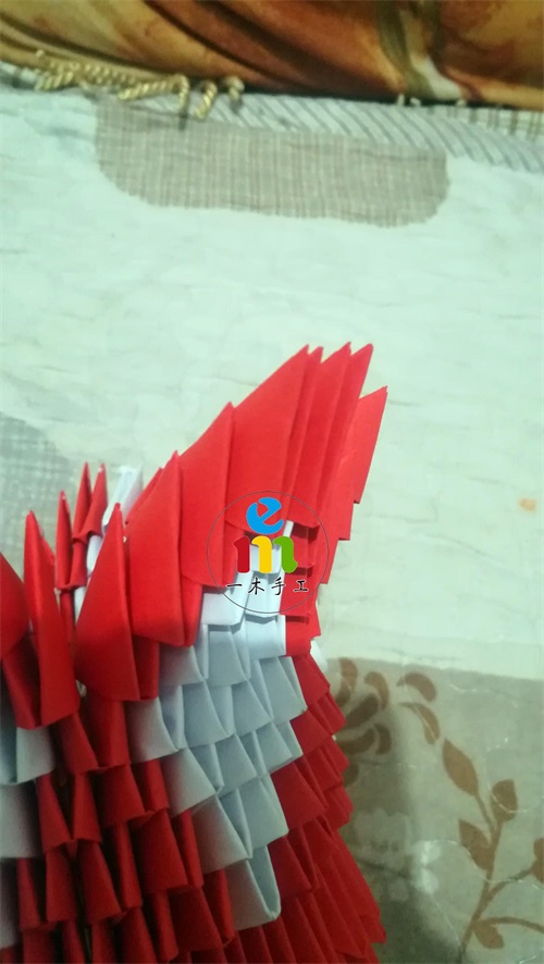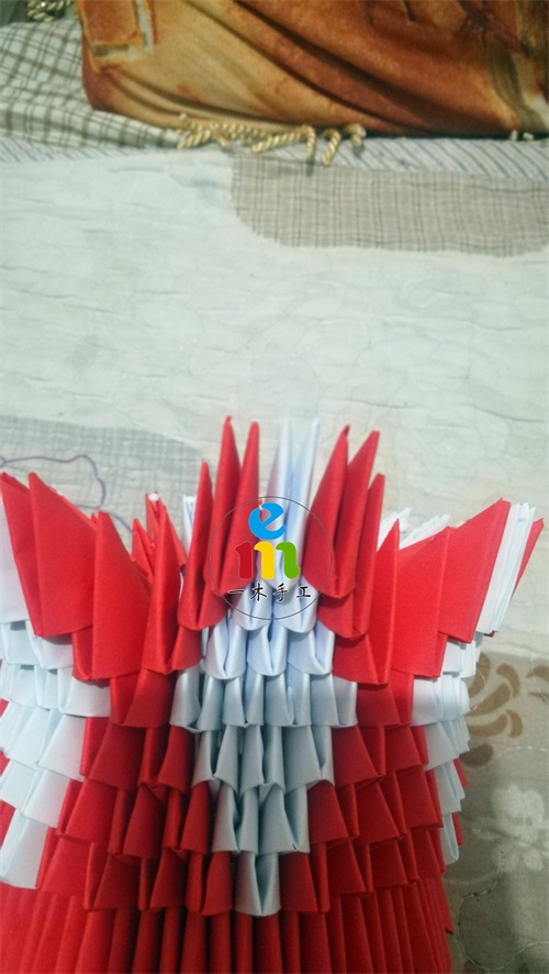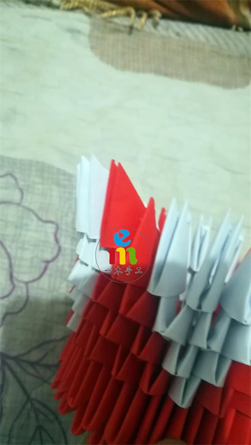 9.第六层反插4个白色1个红色,依次4个白色1个红色,4个白色1个红色,4个白色1个红色,4个白色1个红色,4个白色1个红色完成(这个时候需要这一层的三角插开始向外扩张如图)。