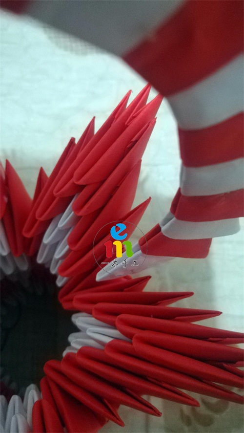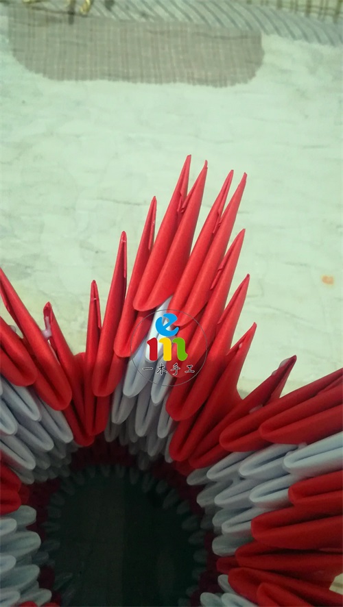 14.开始制作花篮提手,如图按顺序白红各12个排成半圆形,最后反插一个白色,花篮提手完成图,最后两边上胶水然后粘贴在篮筐的两个花瓣的中间图,六瓣花篮制作完成。