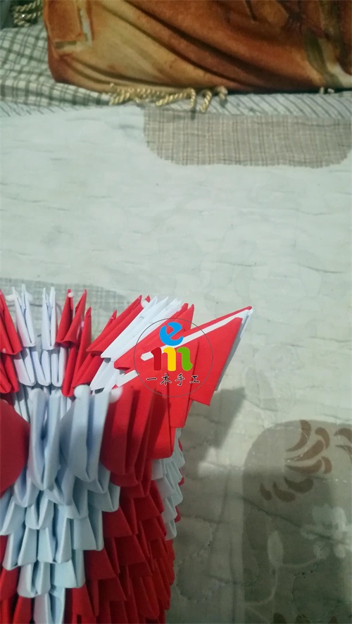 12.开始制作九层,以第八层红白之间开始反插1个红色1个白色1个红色。依次制作6个如图