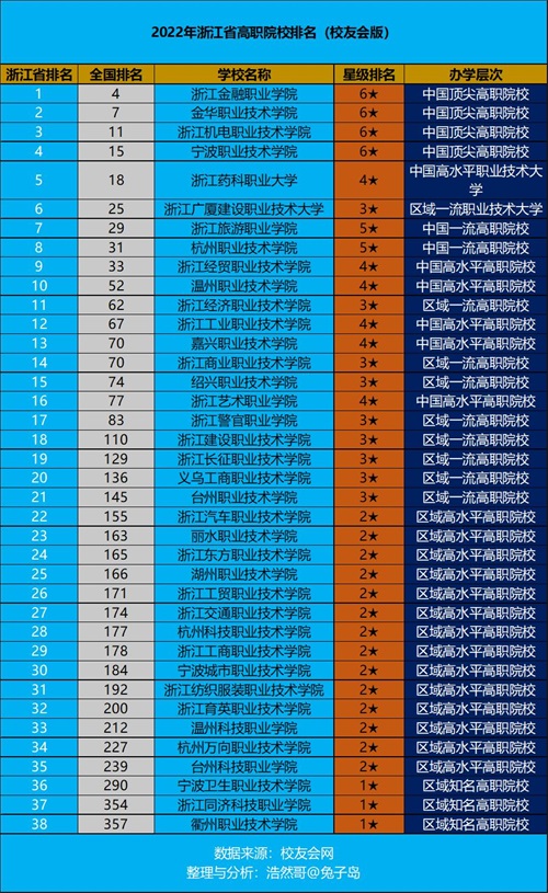 根据中国校友会网(艾瑞深中国校友会网 )最新发布的2022中国大学排行榜,2022年度的大学排名中浙江省共有38所高职院校进入排名!