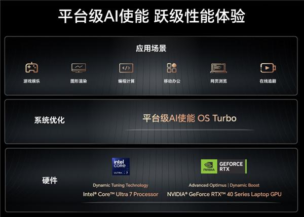 为进一步增强性能,荣耀 MagicBook Pro 16 配备了基于 AI 的 OS Turbo 技术,用户可启动高性能模式,充分释放处理器的全部性能,同时最大限度地减少延迟,并提供更好的图形质量。荣耀 MagicBook Pro 16 还具备智能调度和调整功能,能够智能地识别不同的使用场景,并动态调整以优化性能。对于用户来说就是千人千面,每个用户都能获得一种无缝且量身定制的计算体验。