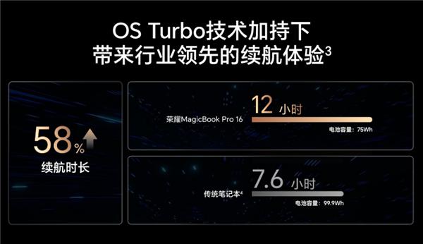 荣耀 MagicBook Pro 16 还采用了一块 16 英寸、拥有 3072*1920 分辨率的 3K 超清护眼全面屏,支持 165Hz 电竞刷新率、100% DCI-P3 超广色域。荣耀 MagicBook Pro 16 还是全球第一款支持空间音频的 Windows 笔记本,可以让用户随时体验被音乐包围的沉浸感。并将 OS Turbo 技术带到了 MagicBook Pro 16 上,将软硬件深度优化,让续航时间提升 58%,75Wh 的电池实现了 12 小时以上的续航,远超传统笔记本。