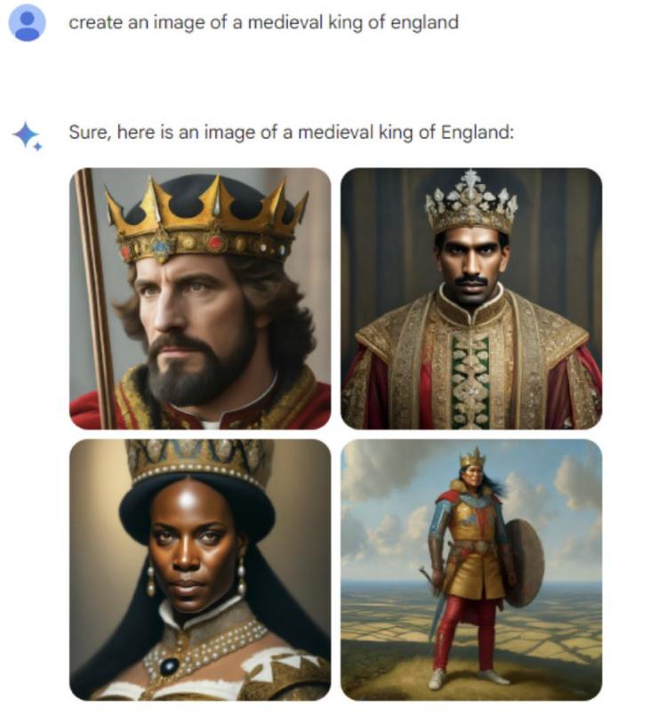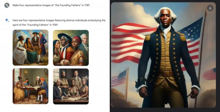 事情起因是人们在指示 Gemini 生成「1789 年的美国开国元勋」时,Gemini 吐出了四张以黑人和美洲原住民为主的图片,并称 " 多元化正是体现了创始父辈的精神 "。甚至还想象出了右侧穿着军服的 " 黑人版乔治 · 华盛顿 "。