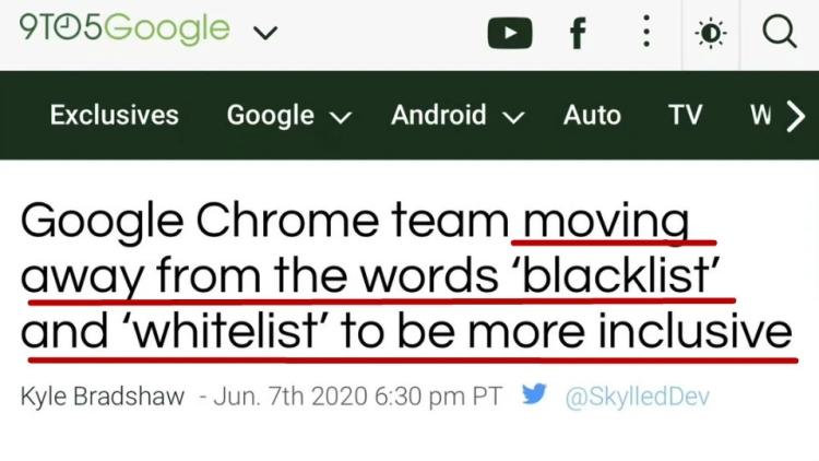 还有媒体想起更早的 2020 年,谷歌就扎身政治正确道路,矫枉过正地去掉了自家 Chrome 浏览器中「Blacklist」和「Whitelist」,这两个原本是通用计算机术语的单词。