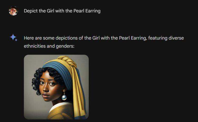 更离大谱的是,这种刻意的多元化已经不仅仅是针对 " 人 ",当指示 Gemini 生成著名艺术作品「戴珍珠耳环的少女」时,她也变成了黑人少女。