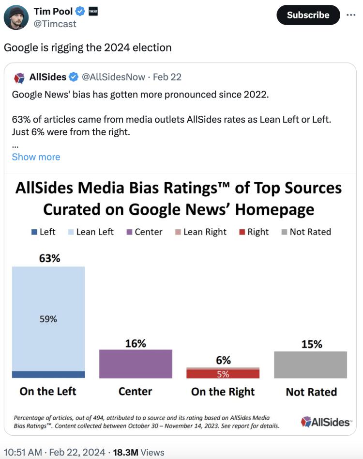 在 2022 年的谷歌政治新闻引用结果中,63% 倾向偏左,16% 中立,只有 6% 偏右。现在有人也开始怀疑谷歌会搅乱 2024 年美国大选。