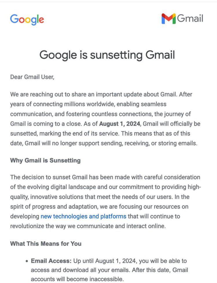 这份后来被证实为假的 " 公告 " 里声称," 在数字化发展和创新方案需求下,Gmail 旅程即将结束。我们将于 2024 年 8 月 1 日正式结束服务。在此日期后您将无法访问自己的 Gmail 邮箱。"
