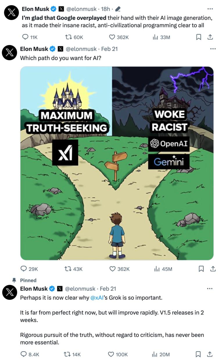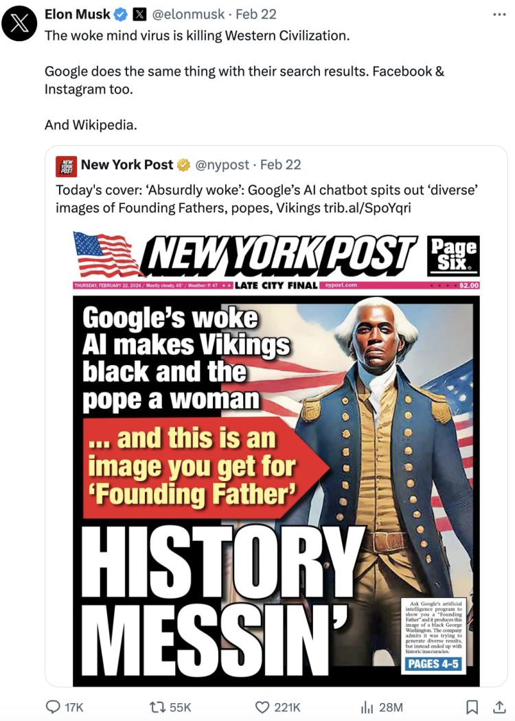 一时间网络炸开锅,Gemini 被各大媒体纷纷矛头对准。马斯克更是带头向谷歌开炮,狠批 " 病毒式的觉醒意识正在摧毁西方文明 ",并把 Facebook、Instagram 和维基百科拉下水,表示这些都是一丘之貉。