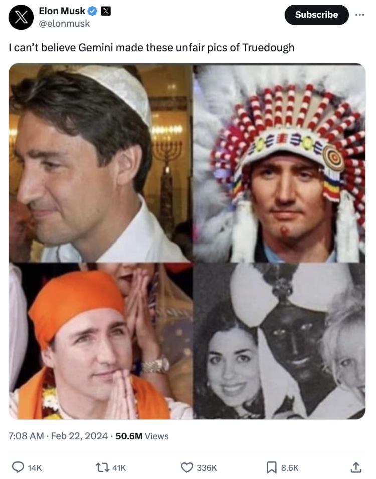 马斯克还贴出了 Gemini 给特鲁多 " 精心定制 " 的各种族裔版本。