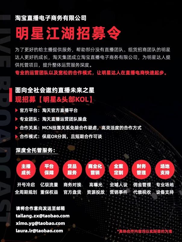 2 月 20 日,淘天集团发布了一份 " 江湖招募令 ",宣布成立一家新的直播电商公司,为有意入淘开播的明星、KOL、MCN 机构提供全托管运营服务。